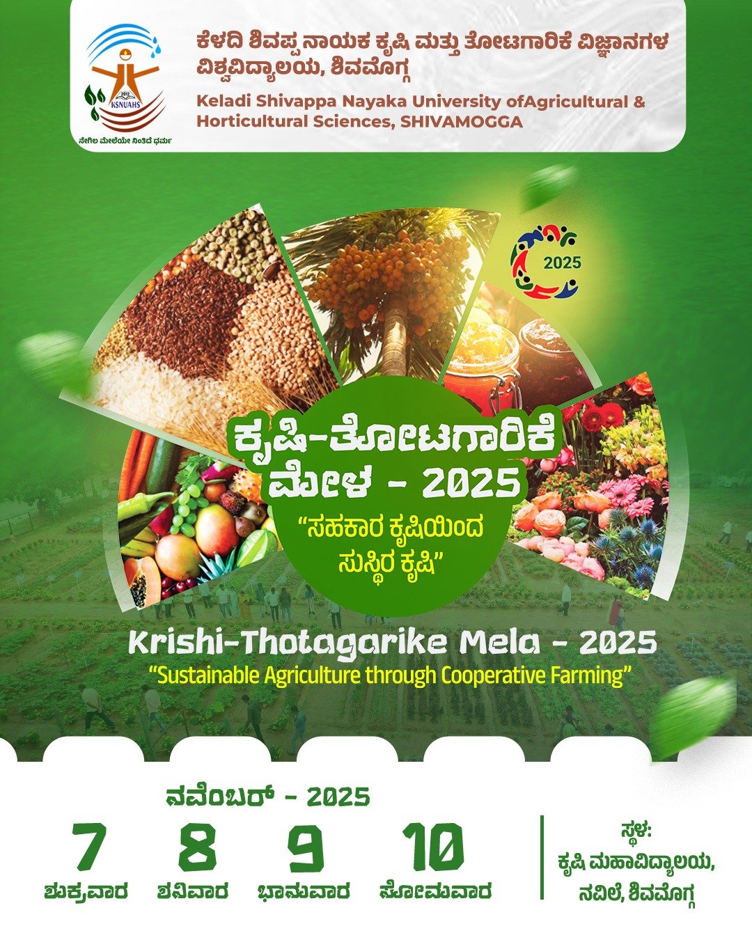 ಕೆಳದಿ ಶಿವಪ್ಪ ನಾಯಕ ಕೃಷಿ ಮತ್ತು ತೋಟಗಾರಿಕೆ ವಿಜ್ಞಾನಗಳ ವಿಶ್ವವಿದ್ಯಾಲಯದ ಆಶ್ರಯದಲ್ಲಿ ಇದೇ ನವೆಂಬರ್07 ರಿಂದ 10ರವರೆಗೆ ಶಿವಮೊಗ್ಗದ ನವುಲೆಯ ಕೃಷಿ…