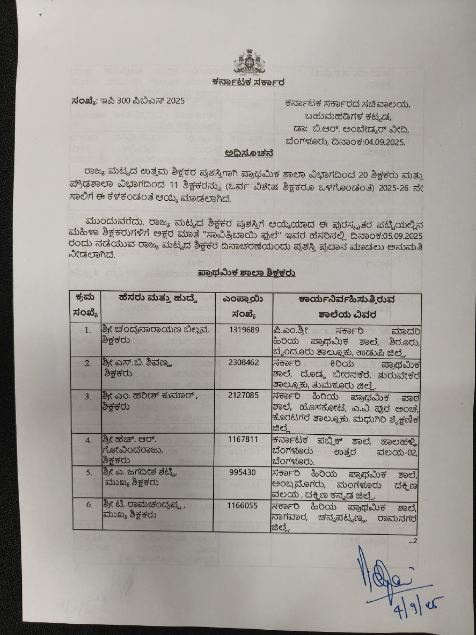 ರಾಜ್ಯ ಮಟ್ಟದ ಉತ್ತಮ ಶಿಕ್ಷಕರ ಪ್ರಶಸ್ತಿಗೆ ಪ್ರಾಥಮಿಕ ಶಾಲಾ ವಿಭಾಗದಿಂದ ೨೦ ಶಿಕ್ಷಕರು ಹಾಗು ಪ್ರೌಢಶಾಲಾ ವಿಭಾಗದಿಂದ ೧೧ ಜನರನ್ನು ೨೦೨೫ -೨೬ ನೇ ಸಾಲಿಗೆ ಆಯ್ಕೆ…