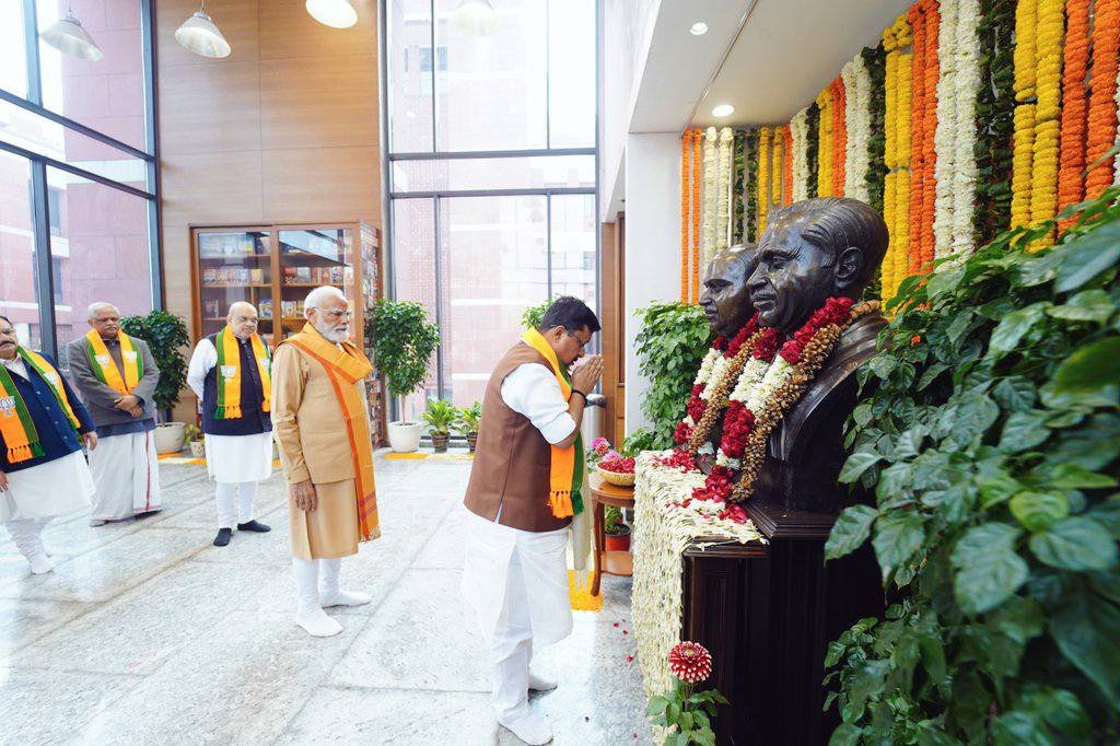 ಬಳಿಕ 12 ನೇ ಅಧ್ಯಕ್ಷರಾಗಿ ಆಯ್ಕೆಯಾಗಿರುವ ನಿತಿನ್ ನಬೀನ್ ಅವರು ಪ್ರಧಾನಿ ನರೇಂದ್ರ ಮೋದಿ ಅವರೊಂದಿಗೆ ಶ್ಯಾಮ ಪ್ರಸಾದ್ ಮುಖರ್ಜಿ ಮತ್ತು ಪಂಡಿತ್ ದೀನದಯಾಳ್ ಅವರ ಪ್ರತಿಮೆಗಳಿಗೆ ಮಾಲಾರ್ಪಣೆ ಮಾಡಿ ಗೌರವ ಸಲ್ಲಿಸಿದರು.