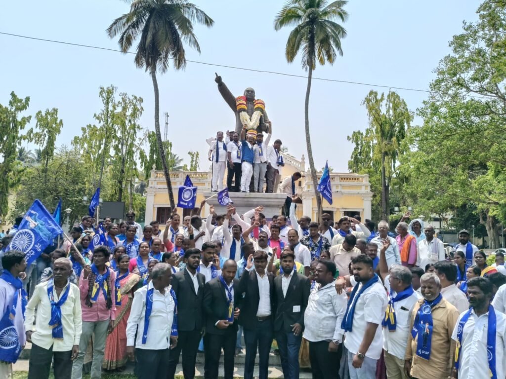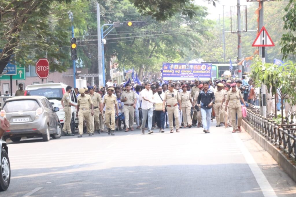 ಇದಕ್ಕೂ ಮುನ್ನ ಮಹಾನಗರಪಾಲಿಕೆ ಆವರಣದಲ್ಲಿ ಜಮಾಯಿಸಿದ್ದ ಸಾವಿರಾರು ಪ್ರತಿಭಟನಾಕಾರರು ಡಾ.ಅಂಬೇಡ್ಕರ ಪ್ರತಿಮೆಗೆ ಮಾಲಾರ್ಪಣೆ ಮಾಡುವ ಮೂಲಕ ಆರಂಭಗೊಂಡ ಮೆರವಣಿಗೆ ವಿವಿಧ ವೃತ್ತಗಳ ಮೂಲಕ ಸಾಗಿ ಶೀನಪ್ಪ ಶೆಟ್ಟಿ ವೃತ್ತದಲ್ಲಿ ಮಾನವ ಸರಪಳಿ ನಿರ್ಮಿಸಿ, ರಸ್ತೆ ತಡೆ ನಡೆಸಿದರು. ಇದರಿಂದಾಗಿ ಕೆಲ ಕಾಲ ವಾಹನ ಸಂಚಾರ ಅಸ್ತವ್ಯಸ್ತಗೊಂಡಿತ್ತು.
