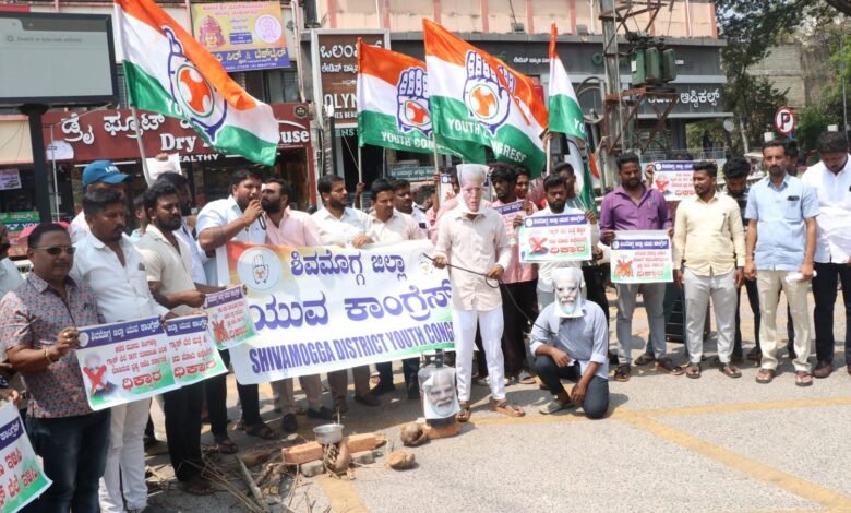 ಶಿವಮೊಗ್ಗ:ಅಡುಗೆ ಅನಿಲ ದಿಢೀರ ಬೆಲೆ ಏರಿಕೆ|ಕೇಂದ್ರದ ವಿರುದ್ದ ಯುವಕಾಂಗ್ರೆಸ್ ಪ್ರತಿಭಟನೆ|ಮೋದಿ, ಟ್ರಂಪ್ ಅಣುಕು ಪ್ರದರ್ಶನ