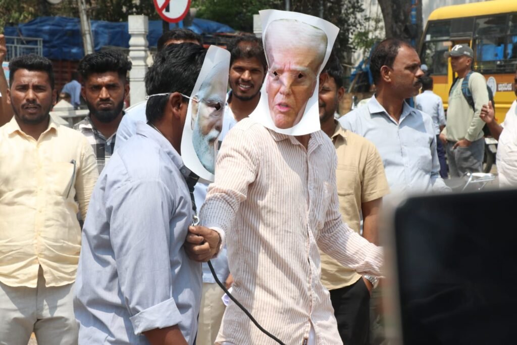 ಮೋದಿ ಹಾಗೂ ಟ್ರಂಪ್ ಮುಖವಾಡ ಧರಿಸಿದ ಕಾರ್ಯಕರ್ತನ ಕುತ್ತಿಗೆಗೆ ಬೆಲ್ಟ್ ಹಾಕಿ ಟ್ರಂಪ್ ಮೋದಿಯನ್ನ ಎಳೆದುಕೊಂಡು ಹೋಗುವಂತೆ ನಡೆದಾಡುವ ಮೂಲಕ ಆಕ್ರೋಶ ಹೊರಹಾಕಿದರು.