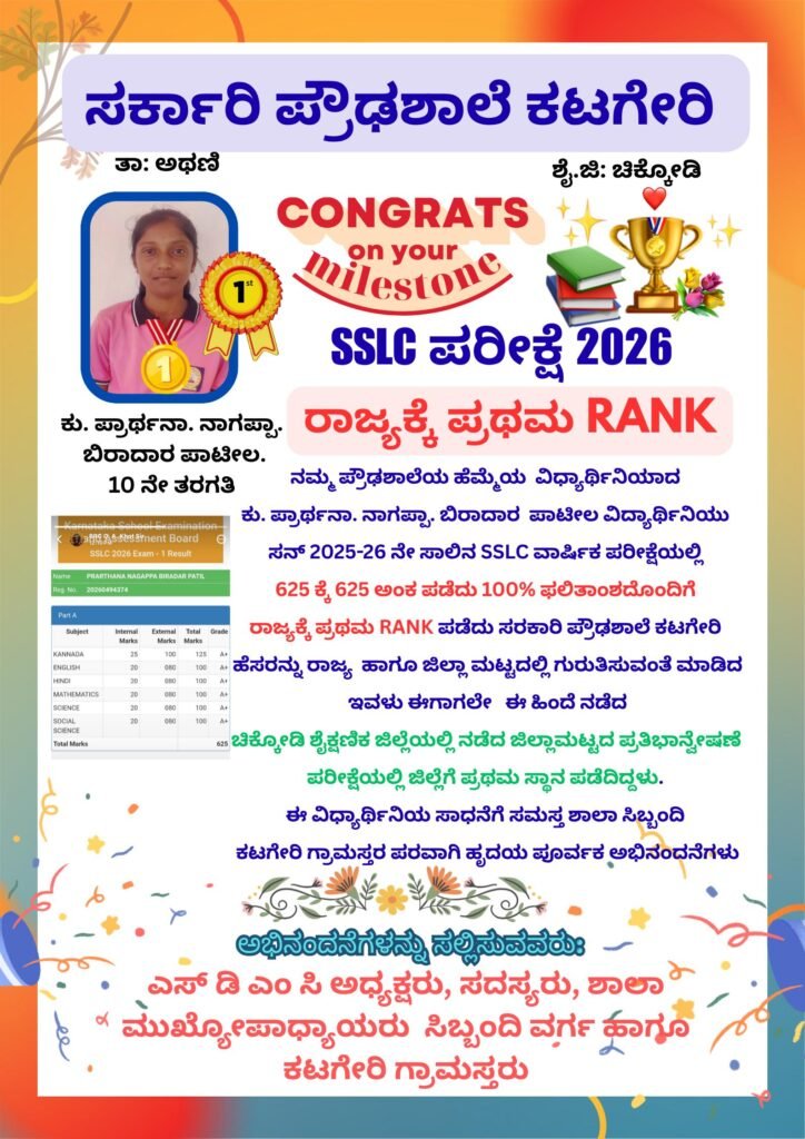 ಬೆಳಗಾವಿಯ ಕಾಟಗೇರಿ ಸರ್ಕಾರಿ ಪ್ರೌಢಶಾಲೆ ವಿದ್ಯಾರ್ಥಿನಿ ಪ್ರಾರ್ಥನಾ ನಾಗಪ್ಪ ಬಿರಾದರ್ ಪಾಟೀಲ್ ರಾಜ್ಯಕ್ಕೆ ಮೊದಲ ಸ್ಥಾನ ಗಳಿಸಿರೋದು ಸರ್ಕಾರಿ ಶಾಲೆಗಳಿಗೆ ಸ್ಪೂರ್ತಿ ಮತ್ತು ಮಾದರಿಯಾಗಿದ್ದಾರೆ.